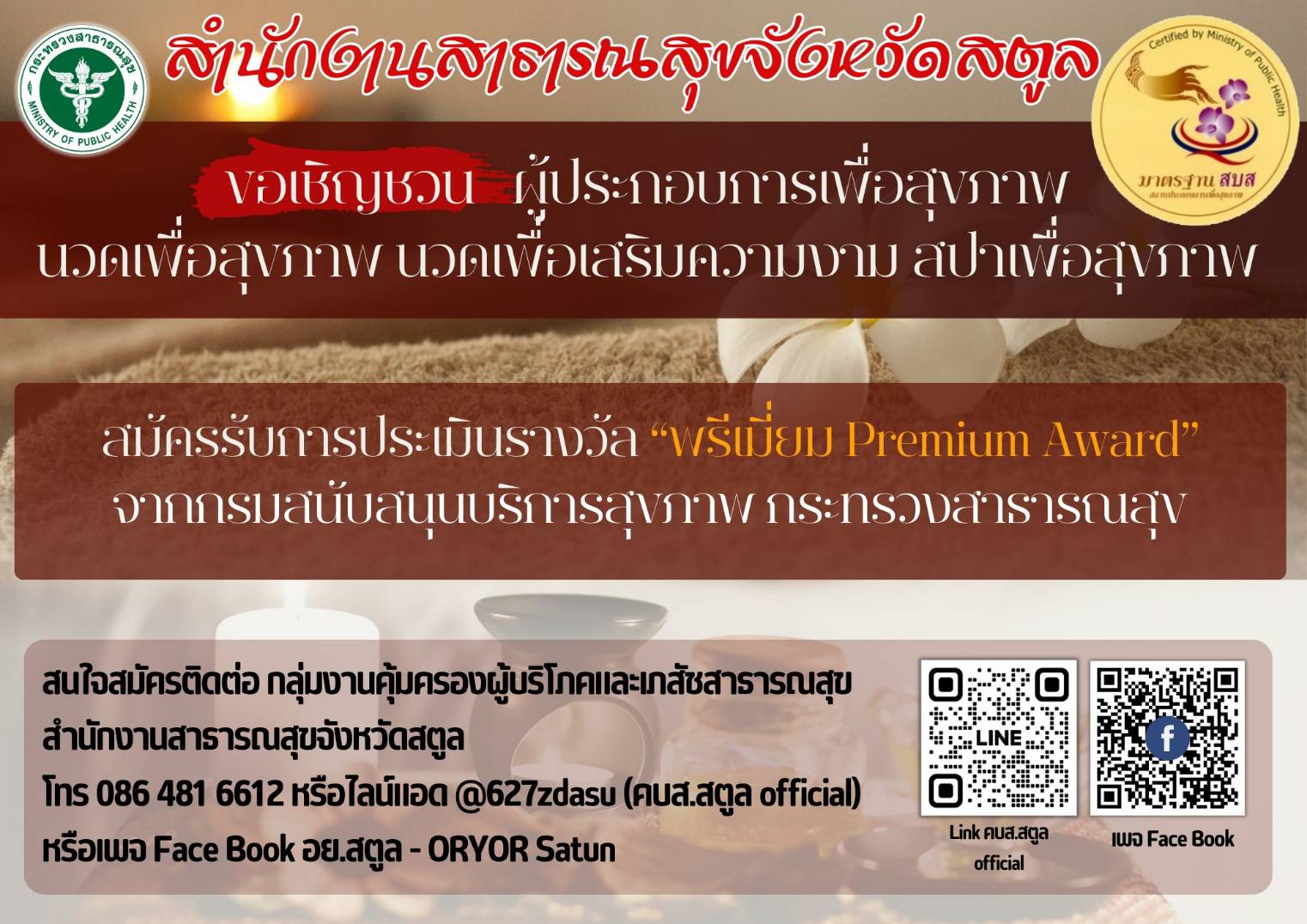 - ประกาศ รับสมัครคัดเลือกเพื่อบรรจุและแต่งตั้งเข้ารับราชการ ตำแหน่ง เภสัชกรปฏิบัติการและพยาบาลวิชาชีพปฏิบัติการ ท่านใดสนใจ สามารถมาสมัครได้ที่ กลุ่มงานบริหารทรัพยากรบุคคล สำนักงานสาธารณสุขจังหวัดสตูล ชั้น 1 ตั้งแต่วันที่ 24-30 ตุลาคม 2566 ในวันและเวลาราชการ